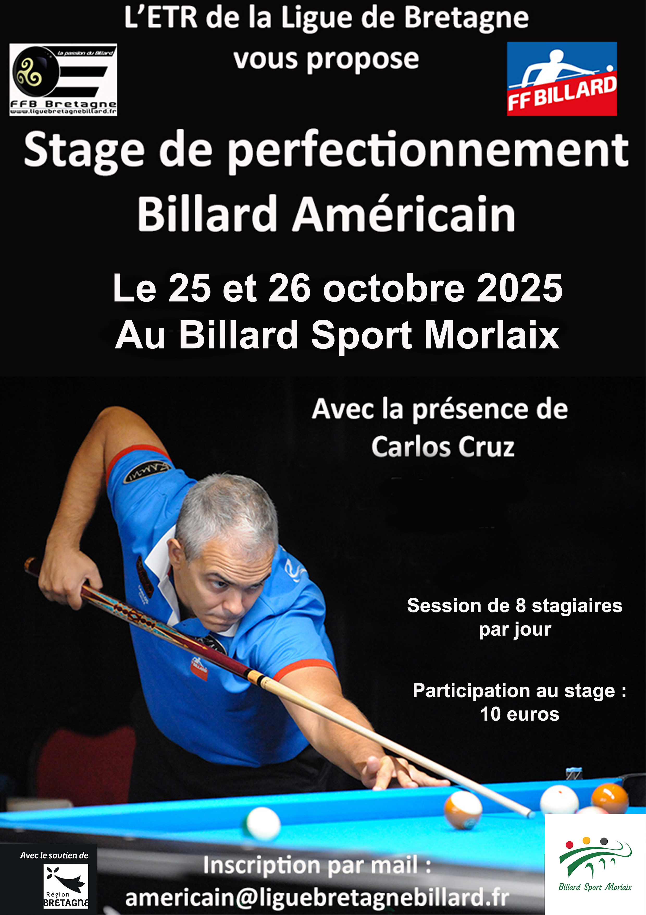 La Commission US et l’Équipe Technique Régionale de la Ligue de Bretagne organisent un stage de perfectionnement au billard américain le week-end du 25 et 26 octobre au club du Billard Sport de Morlaix. Deux sessions sont prévues sur les deux jours, pour un total de 16 participant·e·s (8 par session). Ce stage sera animé par Carlos Cruz, ancien coach de l’équipe de France de billard américain.