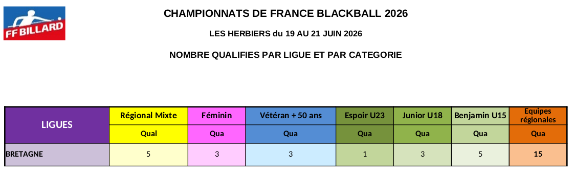 Concernant la catégorie Mixte, 3 places sont réservées à la division Breizh Blackball Elite Tour (hors joueurs du Blackball Master en national ou joueurs qualifiés en mixte national) et 2 places à la division Mixte Challenger. Notre code sportif prévoit un repêchage jusqu'à la 8ème place en division Mixte Challenger, 12ème place en BBET et 10ème place en catégorie spécifique. L'ordre de priorité est donné par le classement RACE à l'issue du TR de Loudéac. Nous devrons fournir le nom des joueuses et joueurs s'engageant aux championnat de France le lundi 25 mai, délai stricte aussi les joueuses et joueurs concernées devront se positionner en amont, qu'ils souhaitent ou qu'ils ne souhaitent pas participer aux championnats de France. Il en va de même pour le championnat de France par équipe ! À ce sujet, le code sportif national ne prévoit plus de sanctions en cas de refus de montée en national.