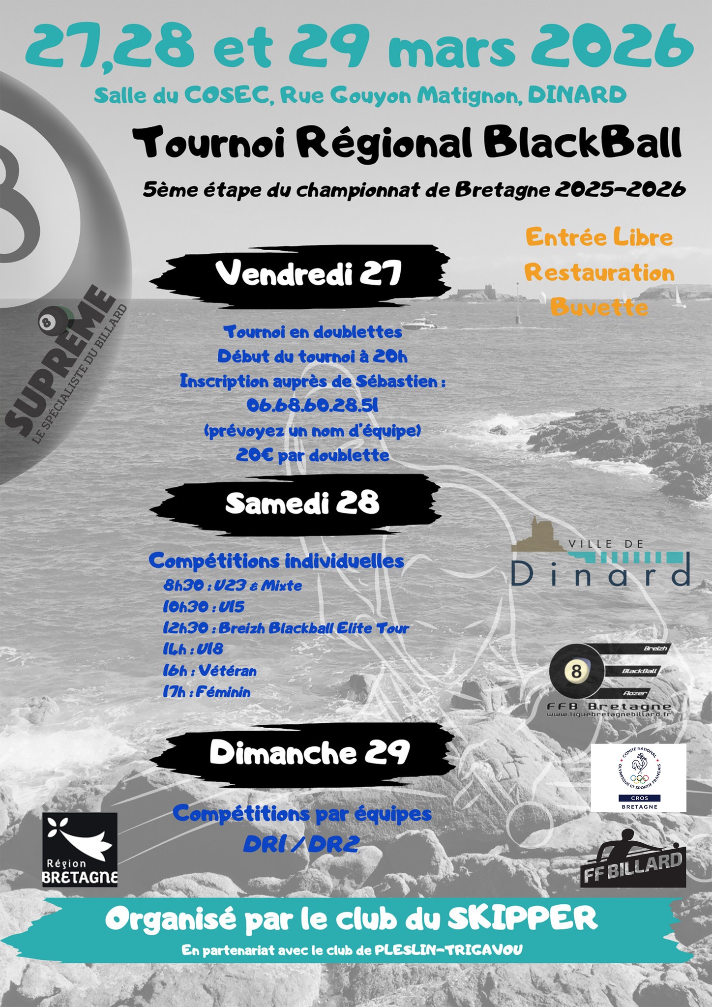 Comme de coutume, le club de Dinard Pool Section organise un tournoi en doublette (formule Coupe Davis) le vendredi 27/03 dès 20h00. Il faut se rapprocher de Sébastien Chatelais pour les inscriptions (20,00€ par doublette). Prévoyez un nom d’équipe !