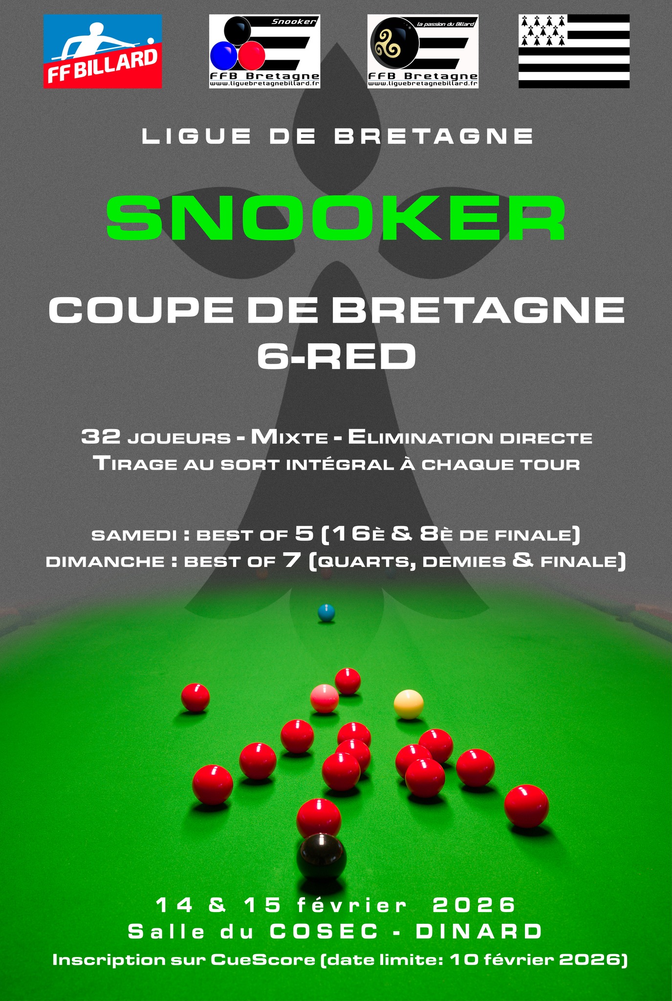 Prochain grand rendez-vous Snooker en Bretagne, le 14 et 15 février à Dinard à l'occasion de la coupe de Bretagne 6 RED avec 32 participants qui seront au départ pour essayé de remporter le graal