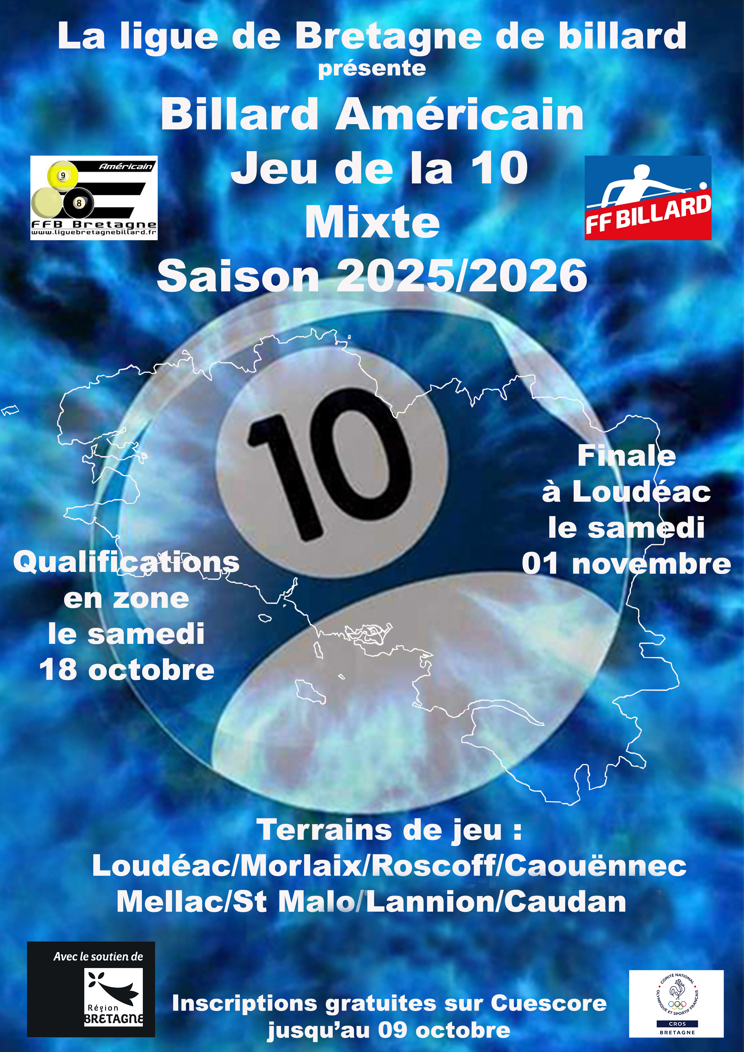 La saison débutera avec les phases qualificatives du Jeu de la 10 le 18 Octobre. Les inscriptions ouvriront à partir du 26 septembre ici : https://cuescore.com/tournament/Bretagn ... s/65729467