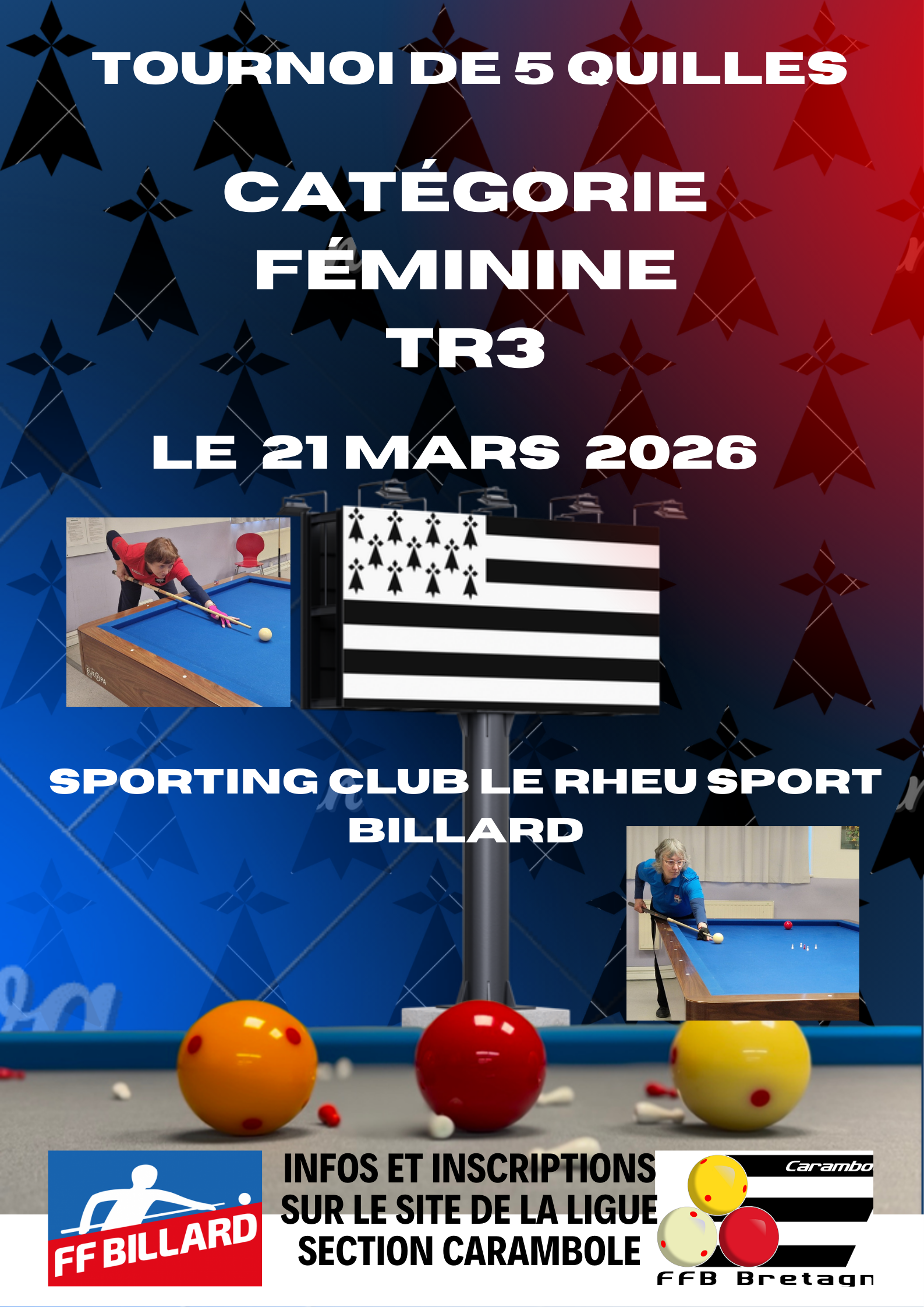 Les inscriptions pour le dernier tournoi de qualification 5 Quilles catégorie féminin est ouvertes, cette 3 éme étape aura lieu au club Le Rheu Sport Billard